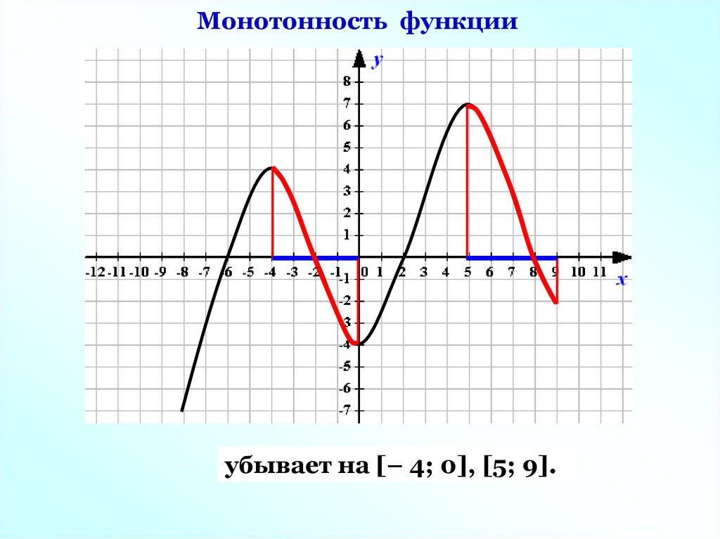 Монотонность функцииубывает на [– 4; 0], [5; 9].