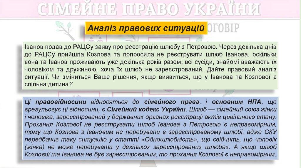 Аналіз правових ситуаційІванов подав до РАЦСу заяву про реєстрацію шлюбу з Петровою. Через декілька днів