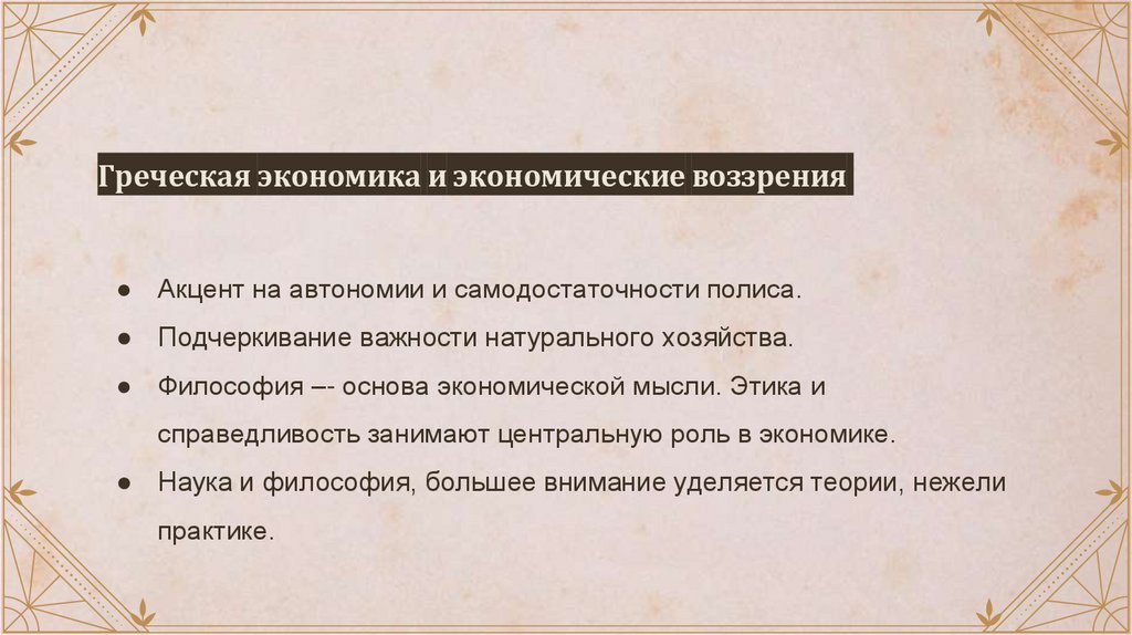 Греческая экономика и экономические воззрения● Акцент на автономии и самодостаточности полиса.