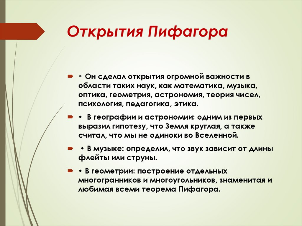 Открытия Пифагора• Он сделал открытия огромной важности в