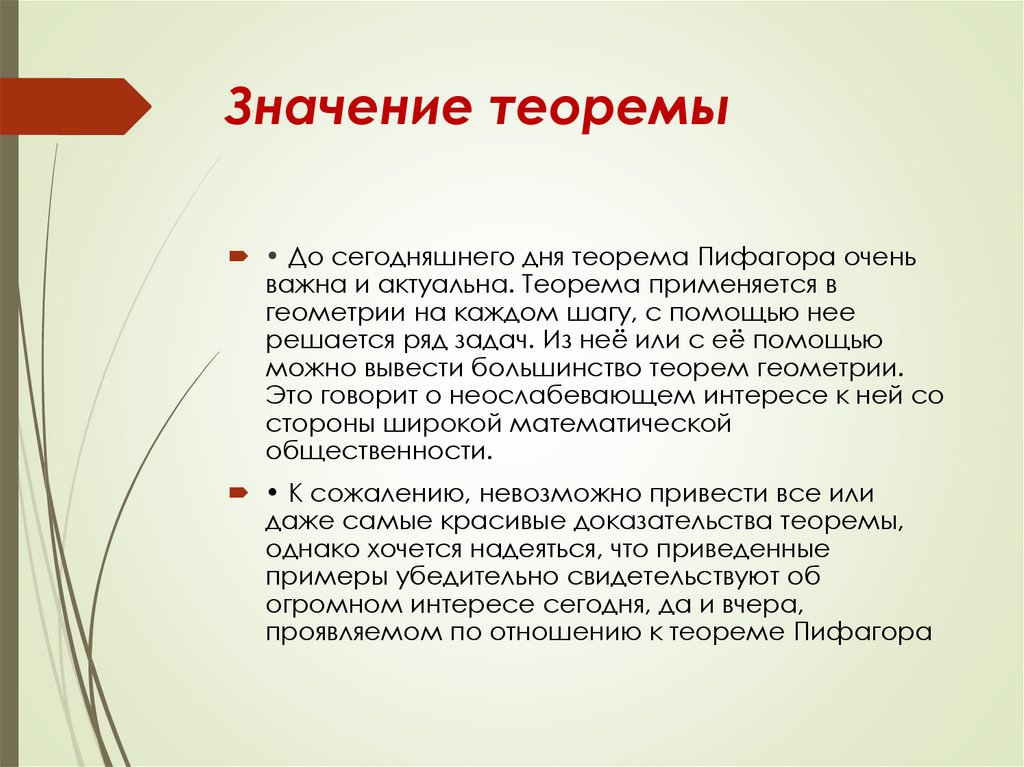 Значение теоремы• До сегодняшнего дня теорема Пифагора очень