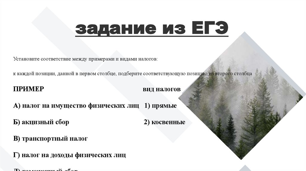 задание из ЕГЭУстановите соответствие между примерами и видами налогов: