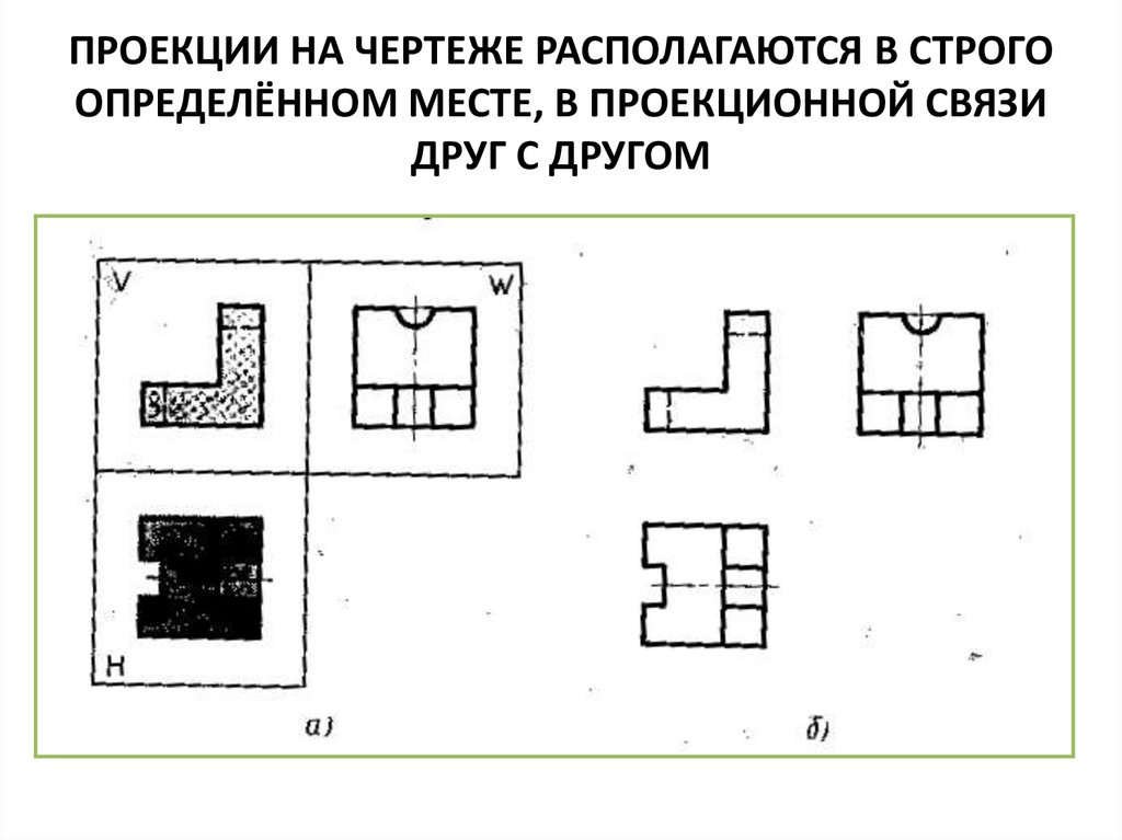 ПРОЕКЦИИ НА ЧЕРТЕЖЕ РАСПОЛАГАЮТСЯ В СТРОГООПРЕДЕЛЁННОМ МЕСТЕ, В ПРОЕКЦИОННОЙ СВЯЗИ
