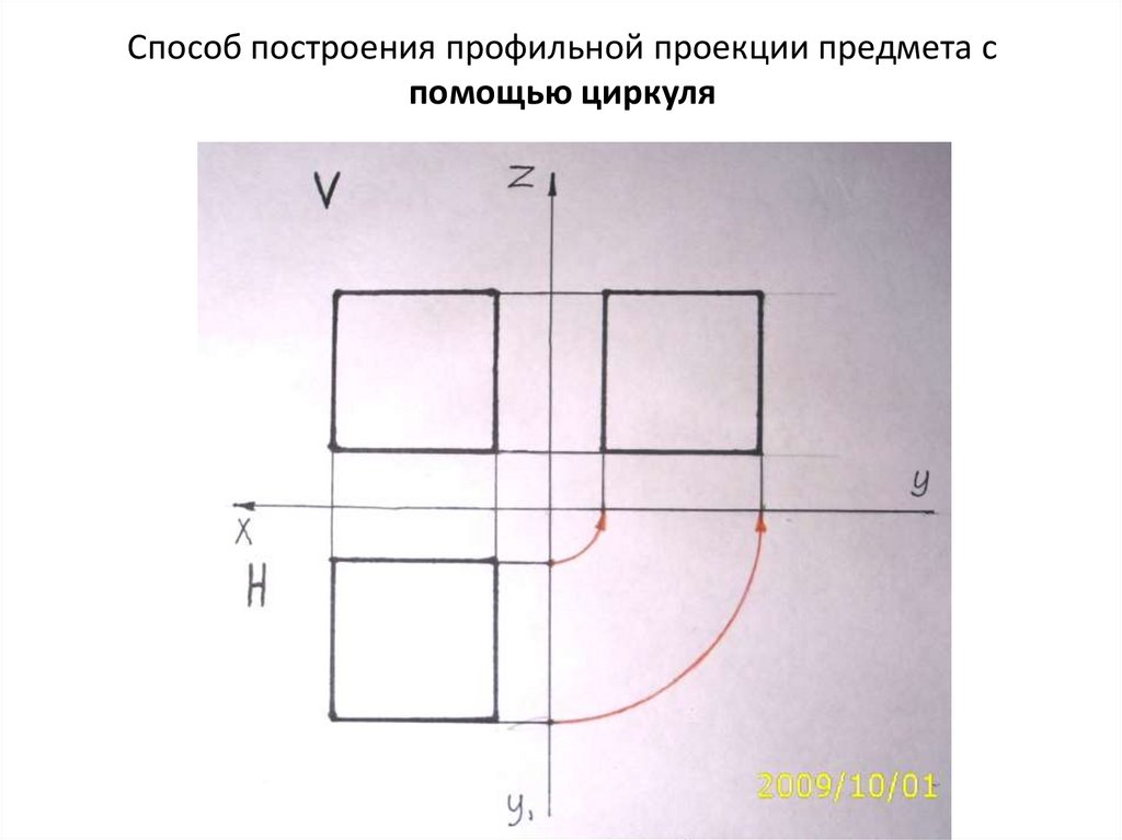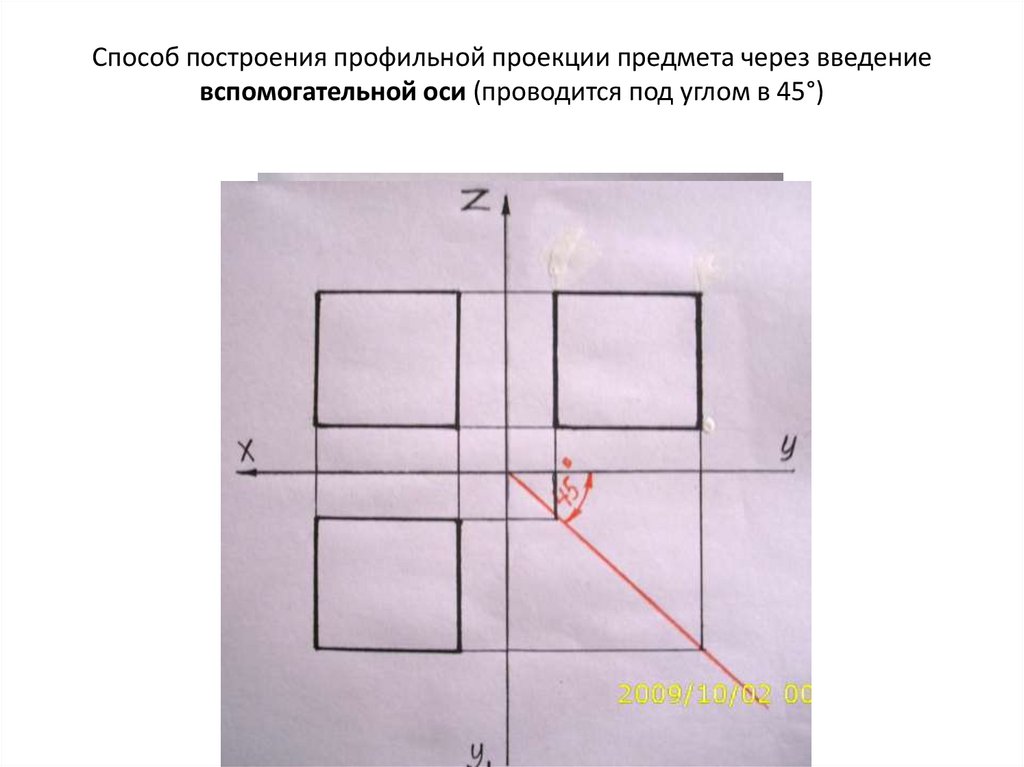 Способ построения профильной проекции предмета через введениевспомогательной оси (проводится под углом в 45°)