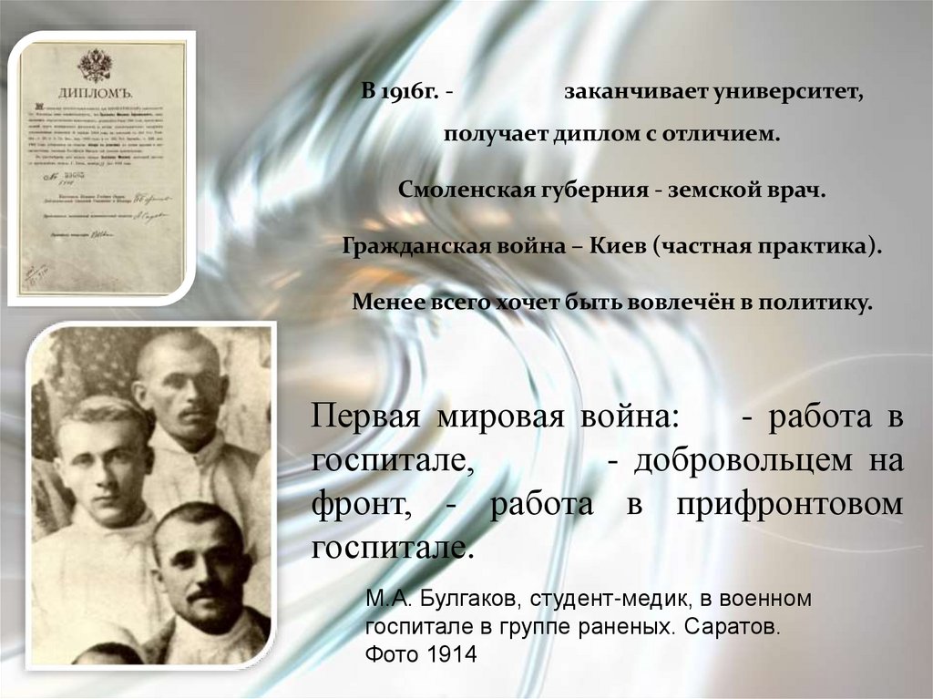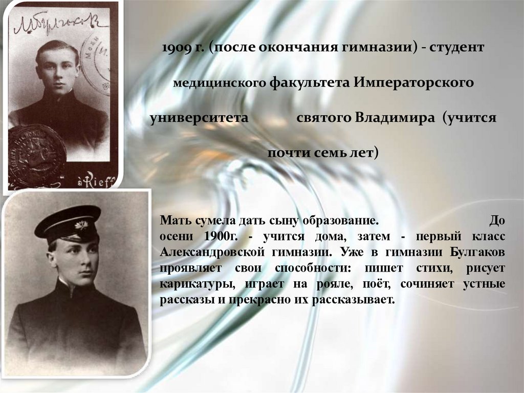 1909 г. (после окончания гимназии) - студентмедицинского факультета Императорского