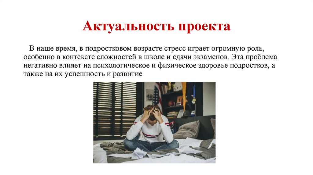Актуальность проектаВ наше время, в подростковом возрасте стресс играет огромную роль,