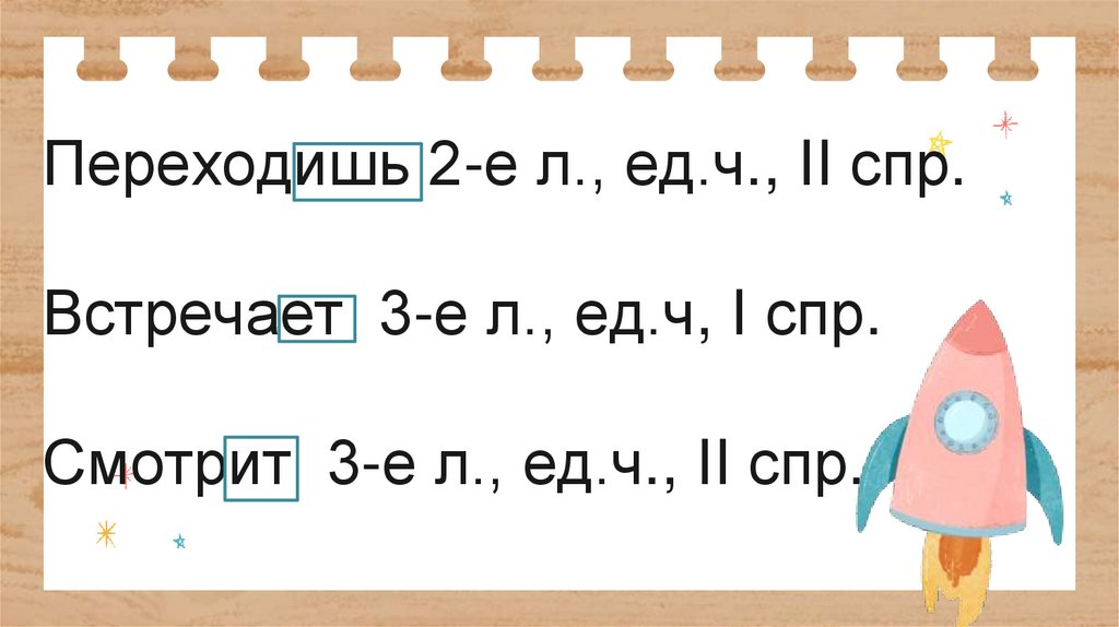 Переходишь 2-е л., ед.ч., II спр.Встречает 3-е л., ед.ч, I спр.