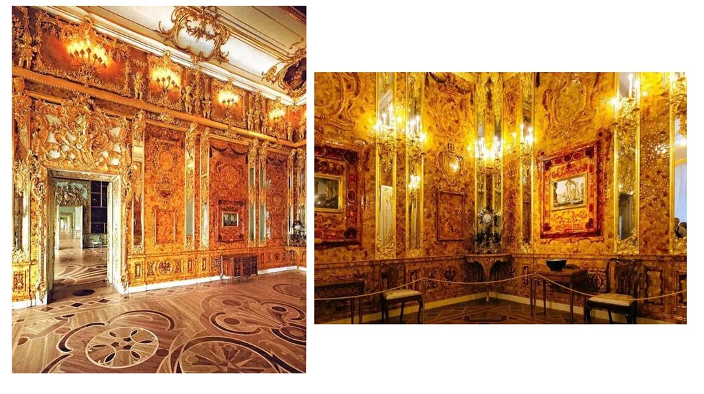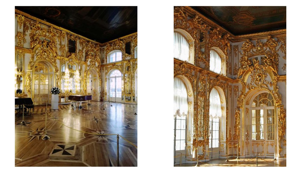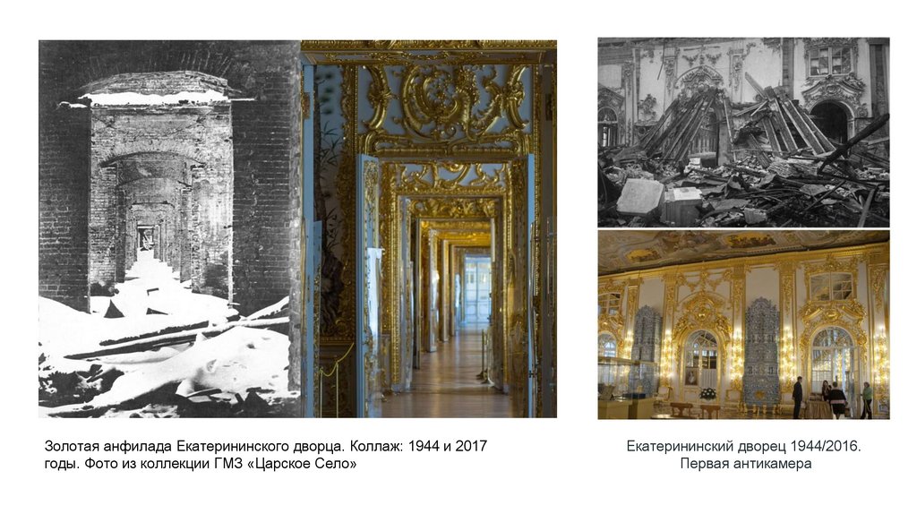 Золотая анфилада Екатерининского дворца. Коллаж: 1944 и 2017годы. Фото из коллекции ГМЗ «Царское Село»