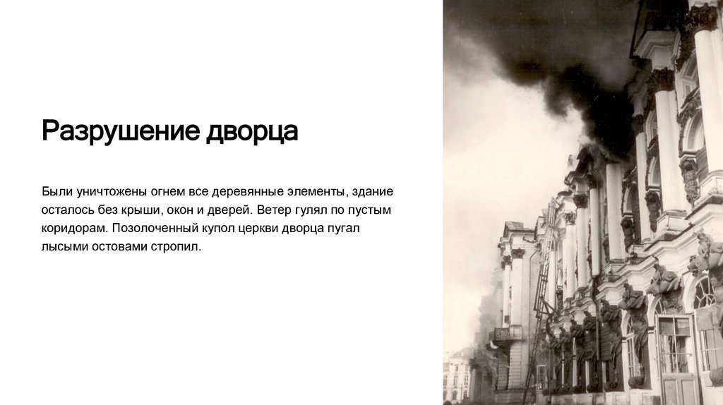 Разрушение дворцаБыли уничтожены огнем все деревянные элементы, здание