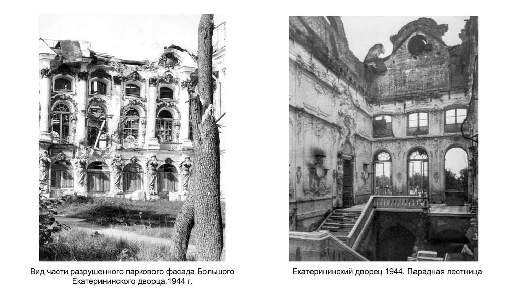 Вид части разрушенного паркового фасада БольшогоЕкатерининского дворца.1944 г.