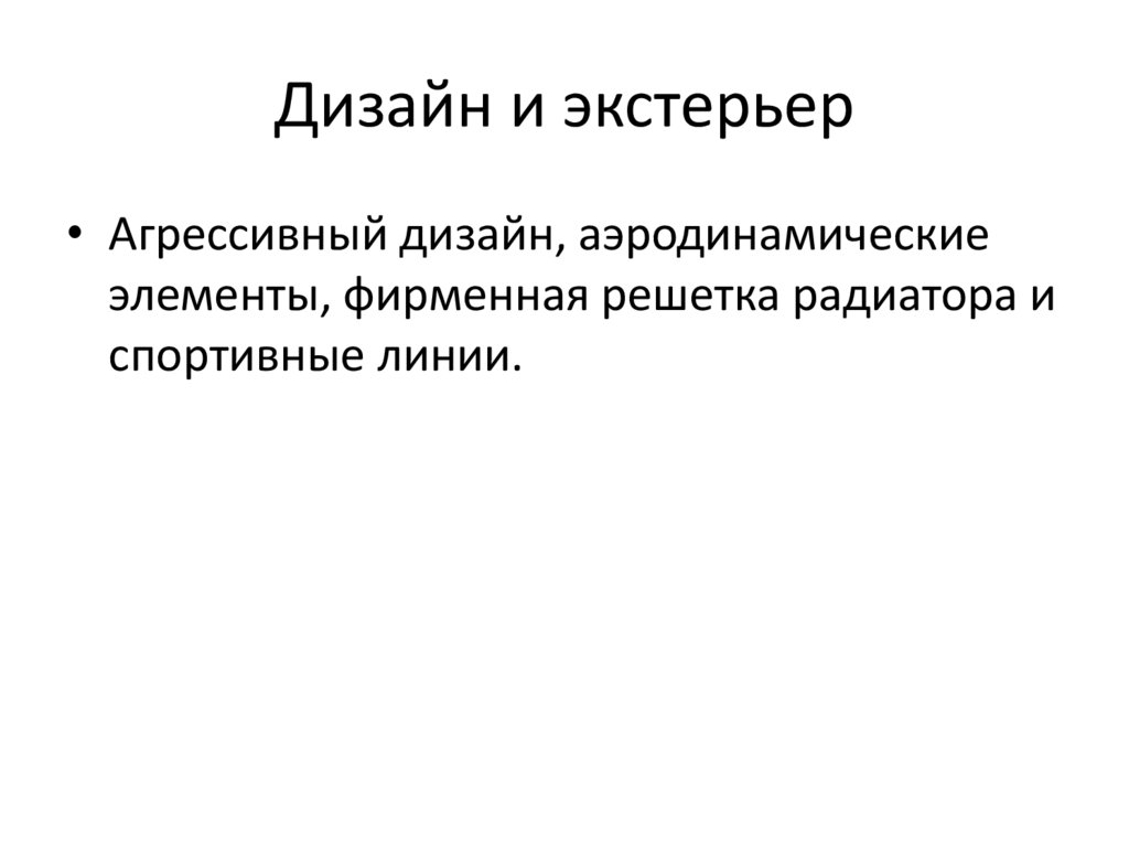 Дизайн и экстерьер• Агрессивный дизайн, аэродинамические