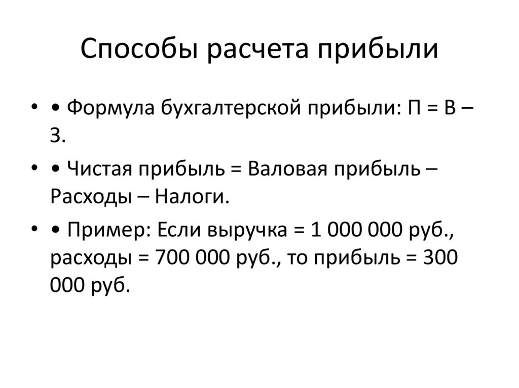 Способы расчета прибыли• • Формула бухгалтерской прибыли: П = В –