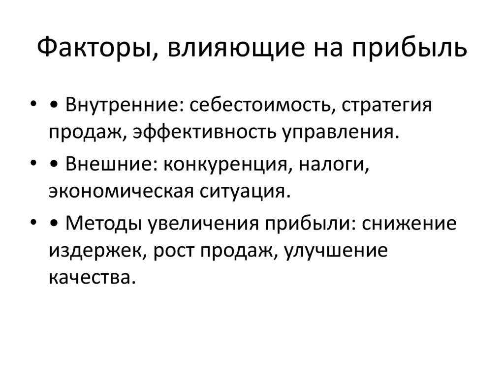 Факторы, влияющие на прибыль• • Внутренние: себестоимость, стратегия