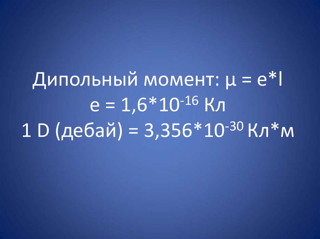 Дипольный момент: μ = e*le = 1,6*10-16 Кл