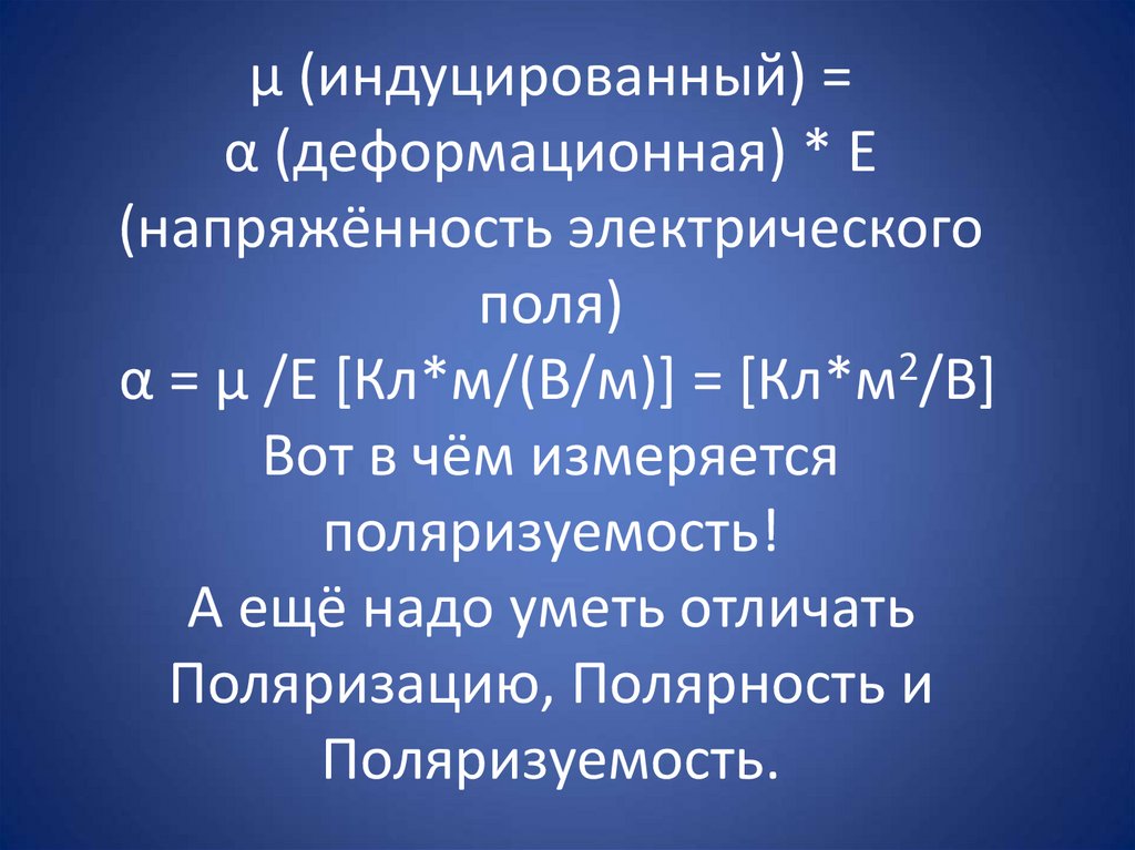 α = μ /E [Кл*м/(В/м)] = [Кл*м2/В]