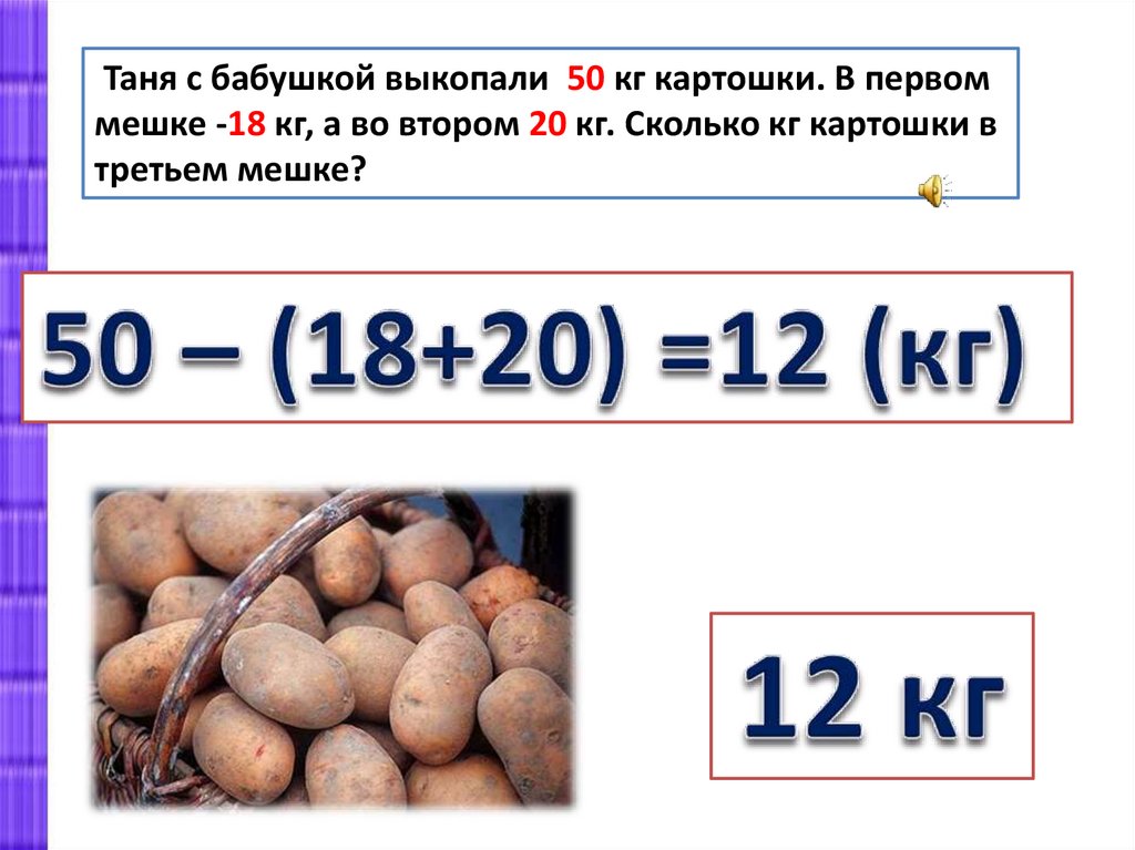 Таня с бабушкой выкопали 50 кг картошки. В первоммешке -18 кг, а во втором 20 кг. Сколько кг картошки в