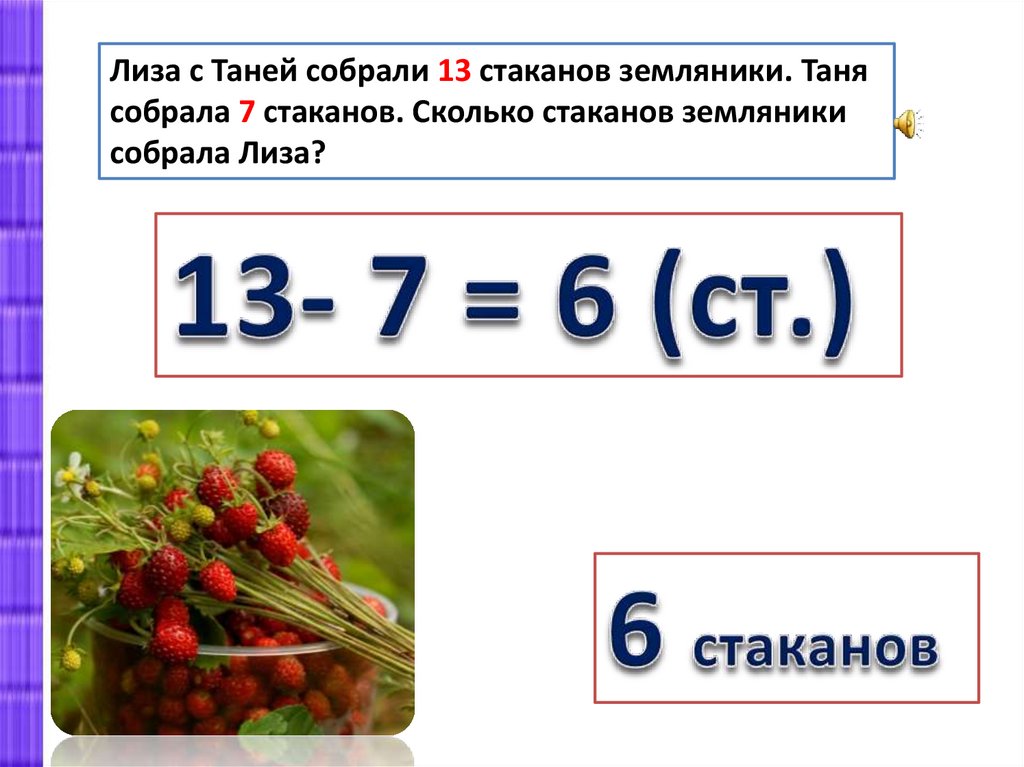 Лиза с Таней собрали 13 стаканов земляники. Танясобрала 7 стаканов. Сколько стаканов земляники