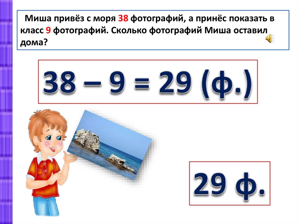 Миша привёз с моря 38 фотографий, а принёс показать вкласс 9 фотографий. Сколько фотографий Миша оставил