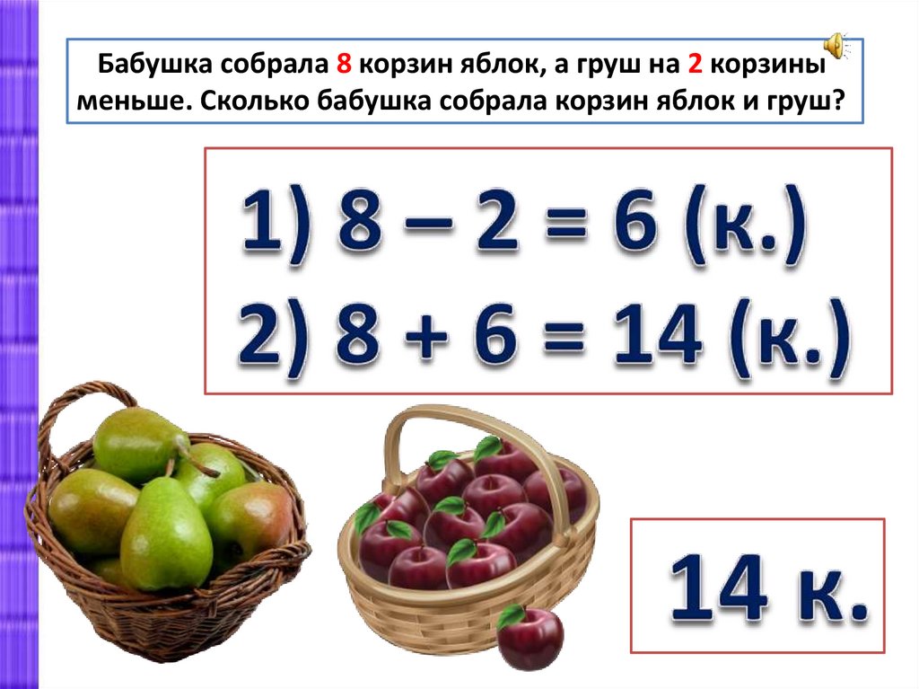 Бабушка собрала 8 корзин яблок, а груш на 2 корзиныменьше. Сколько бабушка собрала корзин яблок и груш?