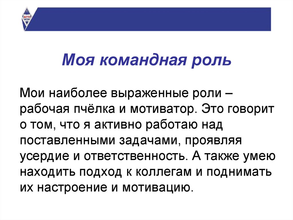 Мои наиболее выраженные роли –рабочая пчёлка и мотиватор. Это говорит