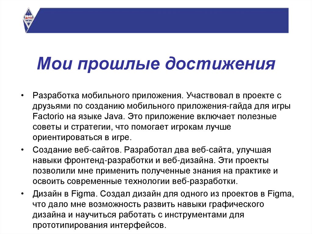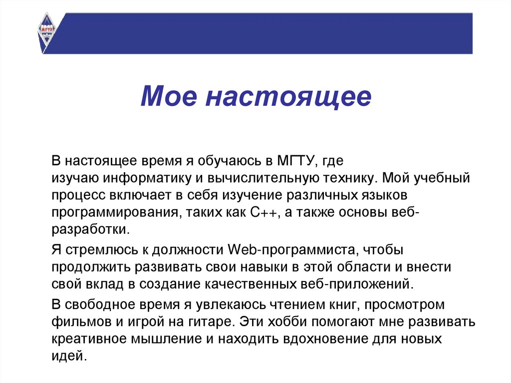 В настоящее время я обучаюсь в МГТУ, гдеизучаю информатику и вычислительную технику. Мой учебный