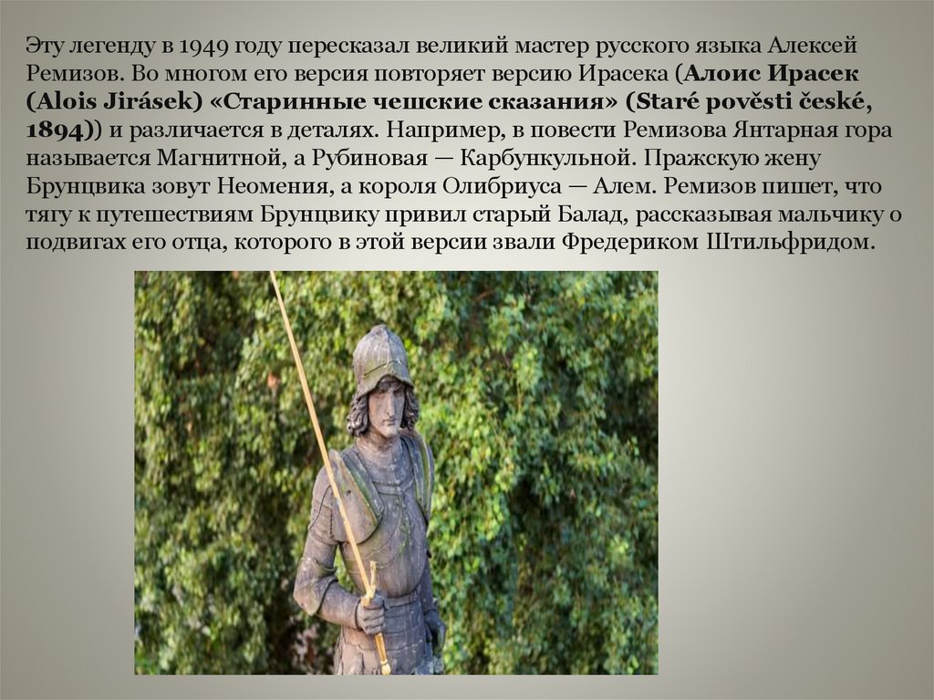 Эту легенду в 1949 году пересказал великий мастер русского языка АлексейРемизов. Во многом его версия повторяет версию Ирасека (Алоис Ирасек