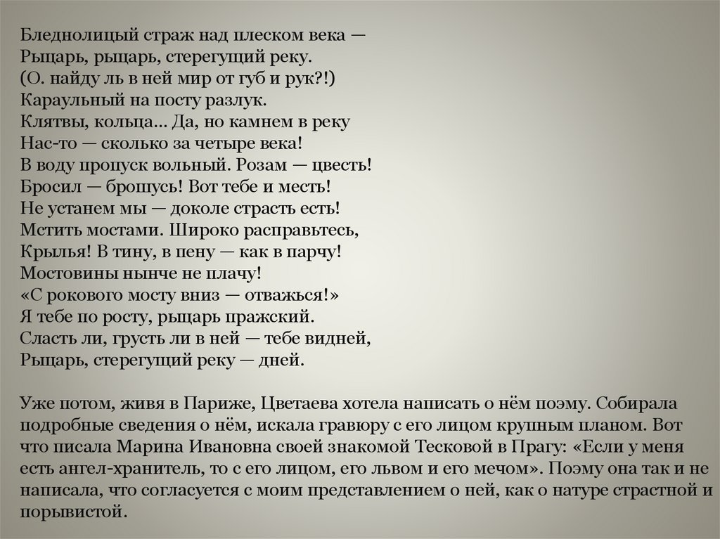 Уже потом, живя в Париже, Цветаева хотела написать о нём поэму. Собирала