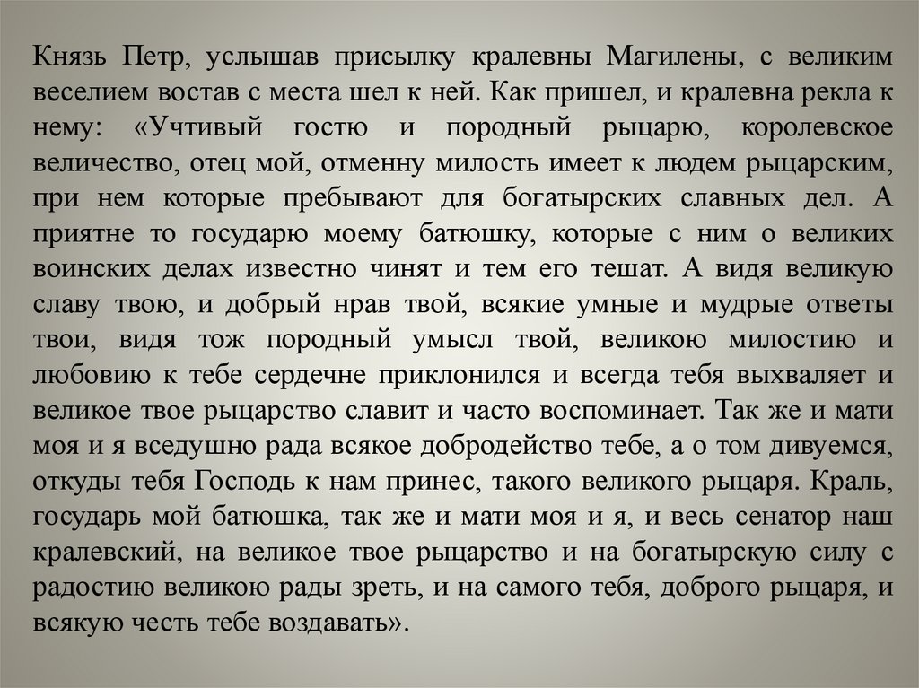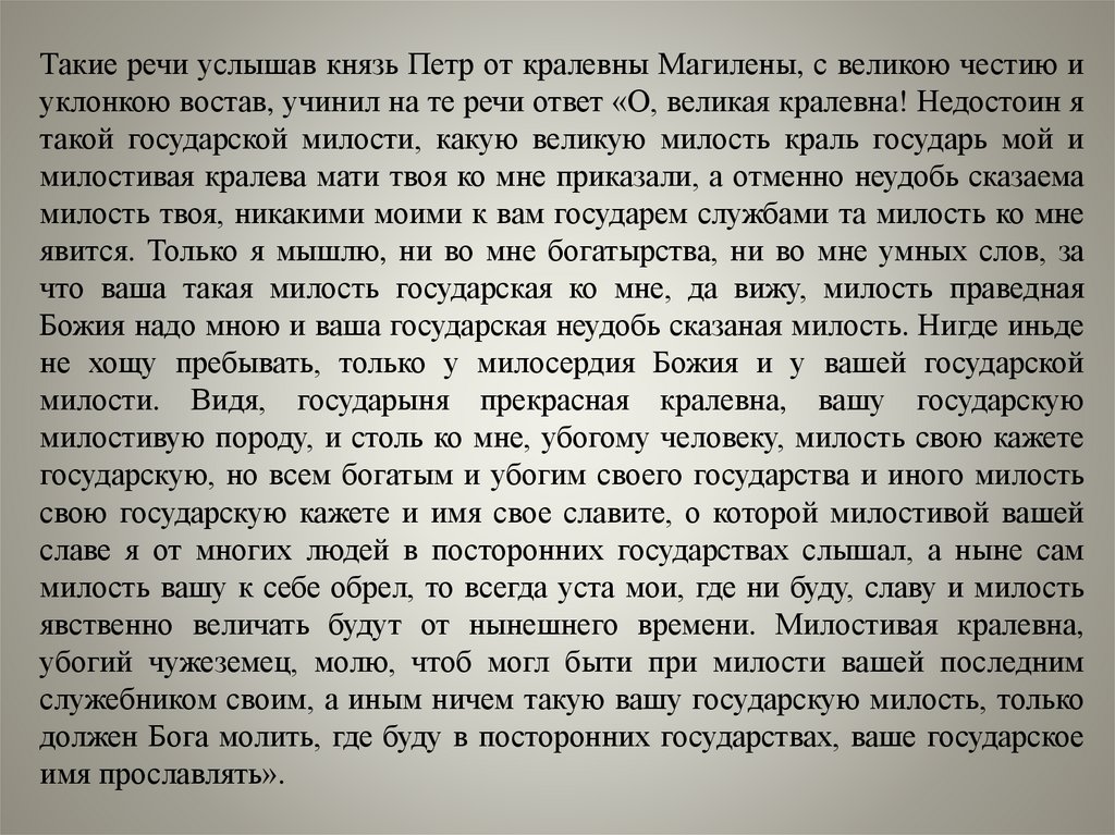 Такие речи услышав князь Петр от кралевны Магилены, с великою честию иуклонкою востав, учинил на те речи ответ «О, великая кралевна! Недостоин я
