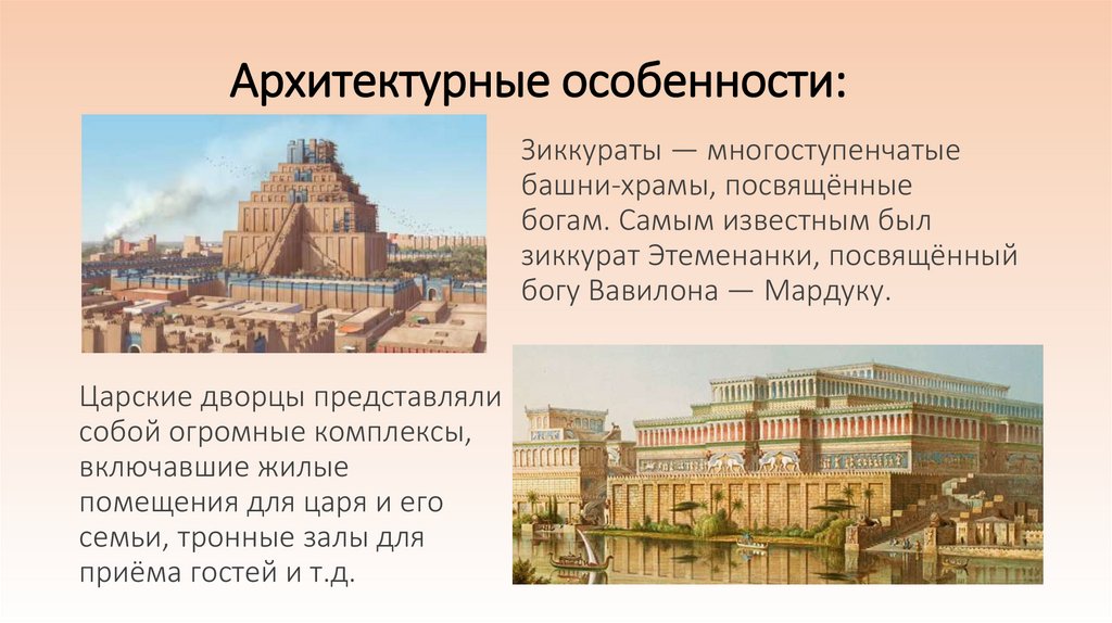 Архитектурные особенности:Зиккураты — многоступенчатые