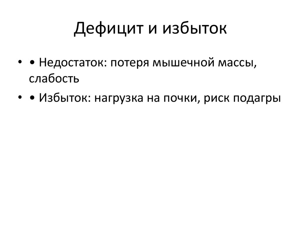Дефицит и избыток• • Недостаток: потеря мышечной массы,