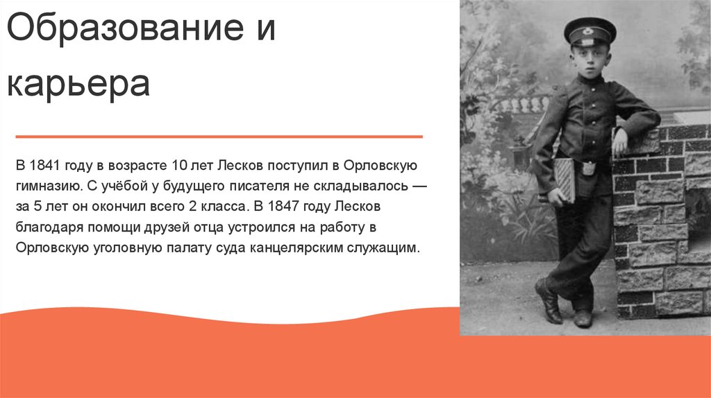 В 1841 году в возрасте 10 лет Лесков поступил в Орловскую