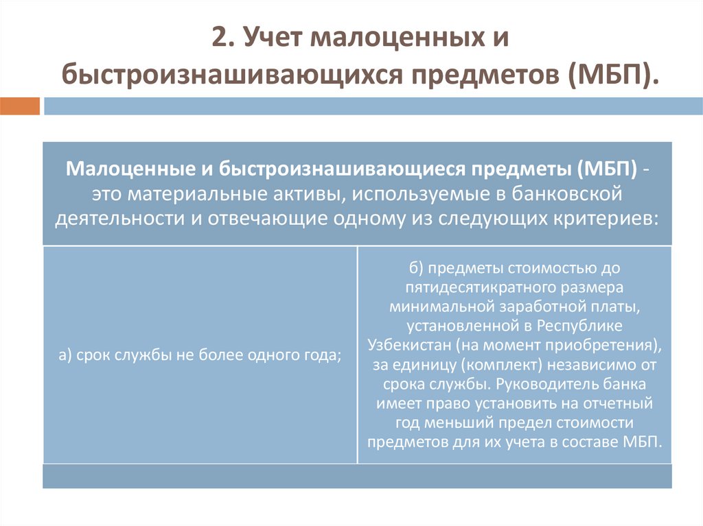 2. Учет малоценных и быстроизнашивающихся предметов (МБП).
