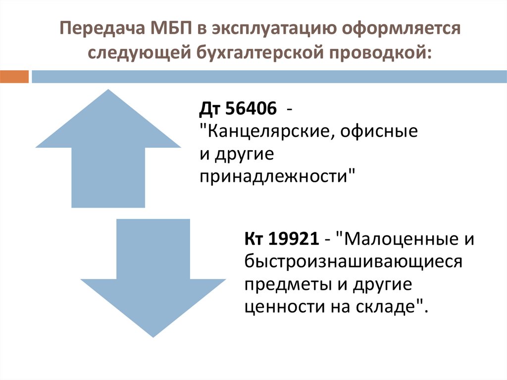 Передача МБП в эксплуатацию оформляетсяследующей бухгалтерской проводкой: