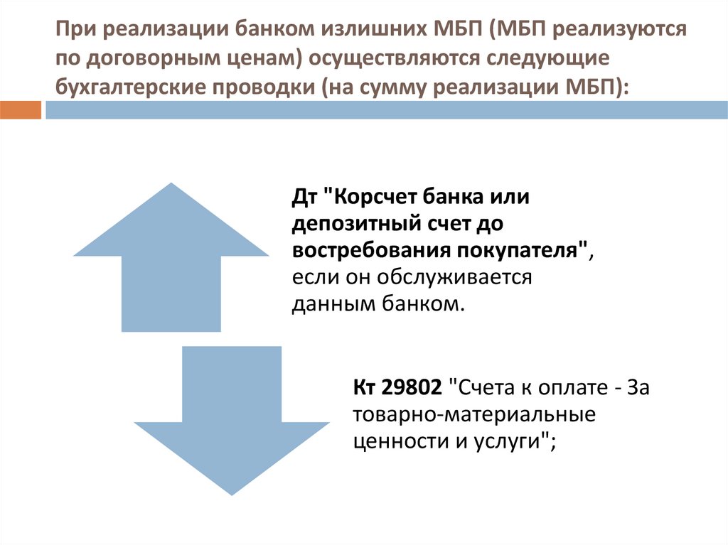 При реализации банком излишних МБП (МБП реализуютсяпо договорным ценам) осуществляются следующие