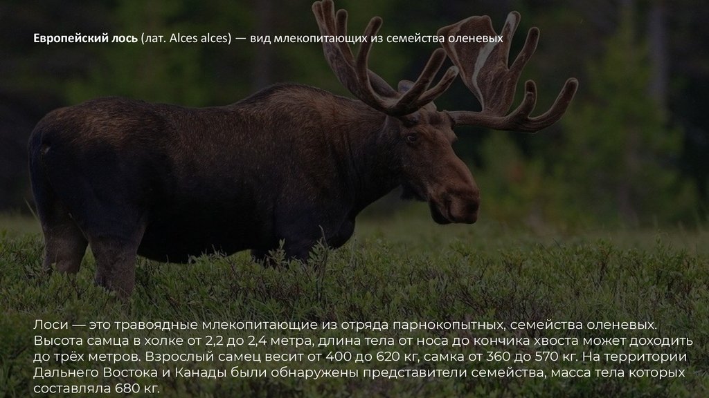 Европейский лось (лат. Alces alces) — вид млекопитающих из семейства оленевыхЛоси — это травоядные млекопитающие из отряда парнокопытных, семейства оленевых.