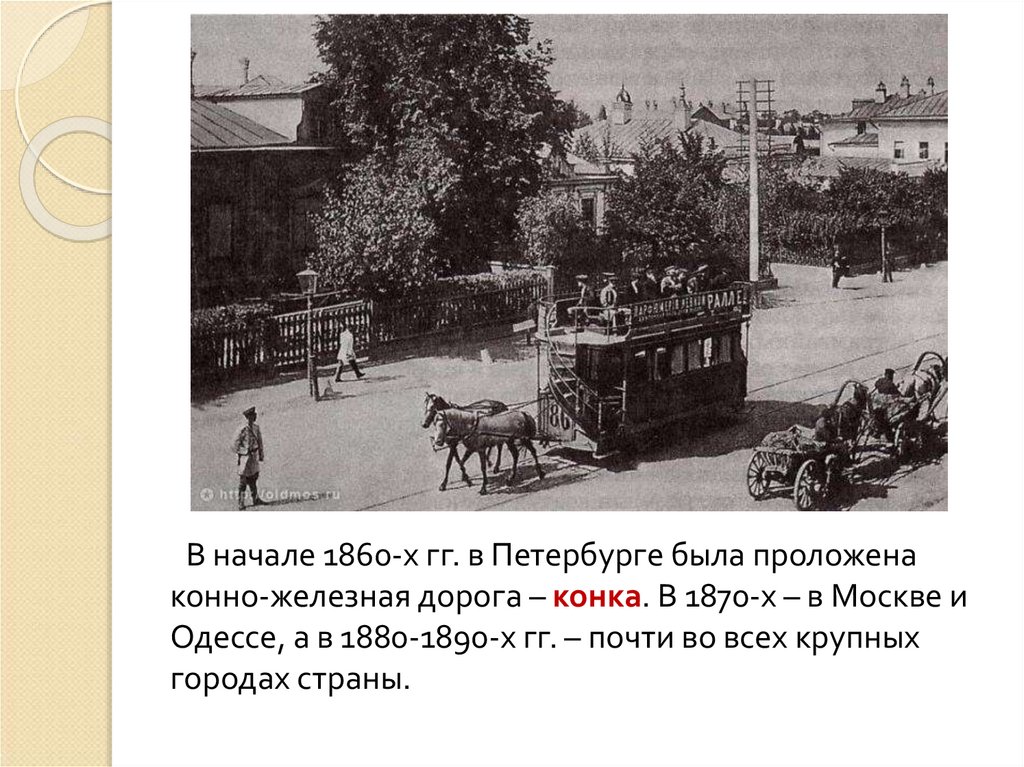 В начале 1860-х гг. в Петербурге была проложенаконно-железная дорога – конка. В 1870-х – в Москве и