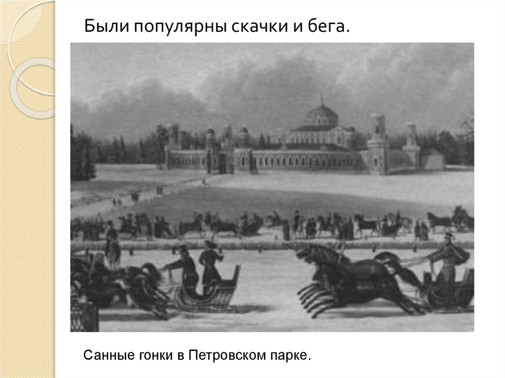 Были популярны скачки и бега.Санные гонки в Петровском парке.