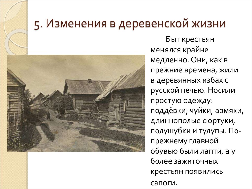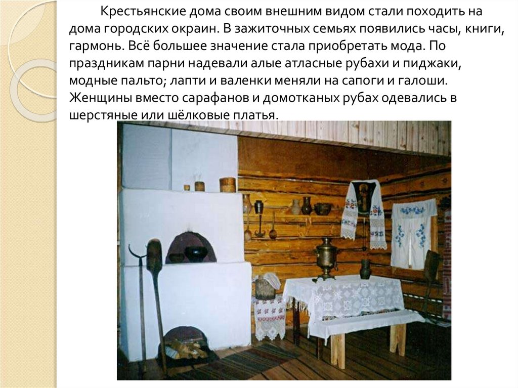 Крестьянские дома своим внешним видом стали походить надома городских окраин. В зажиточных семьях появились часы, книги,