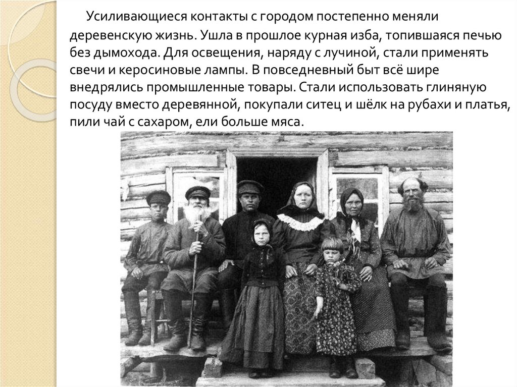 Усиливающиеся контакты с городом постепенно менялидеревенскую жизнь. Ушла в прошлое курная изба, топившаяся печью