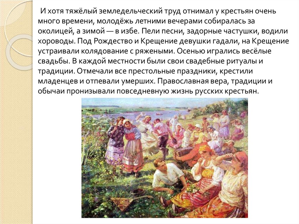 И хотя тяжёлый земледельческий труд отнимал у крестьян оченьмного времени, молодёжь летними вечерами собиралась за