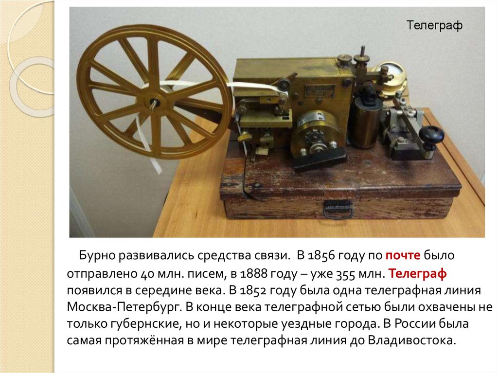 отправлено 40 млн. писем, в 1888 году – уже 355 млн. Телеграф