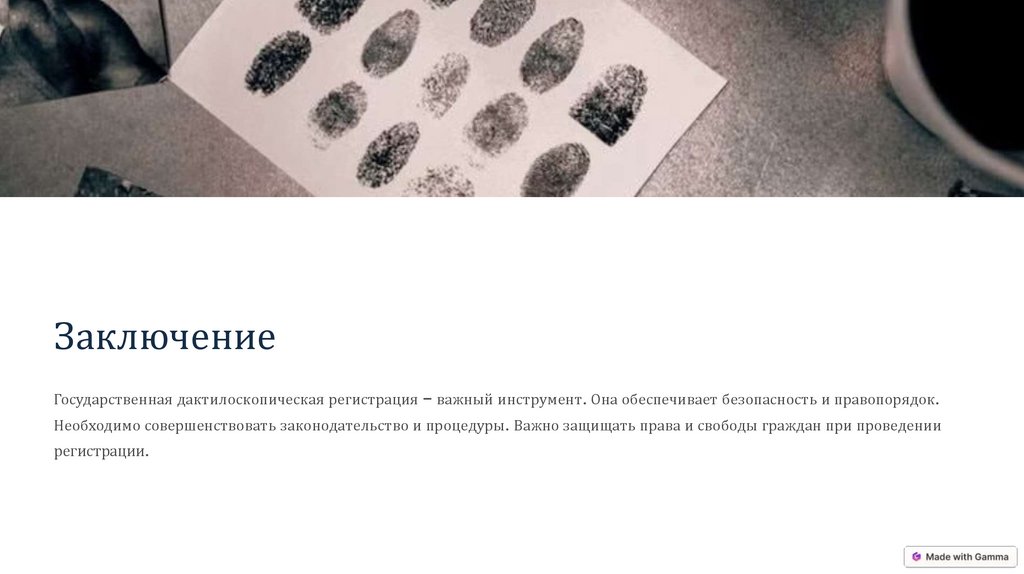 ЗаключениеГосударственная дактилоскопическая регистрация – важный инструмент. Она обеспечивает безопасность и правопорядок.