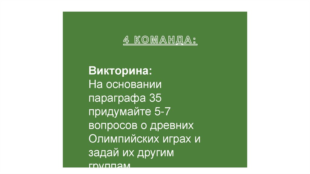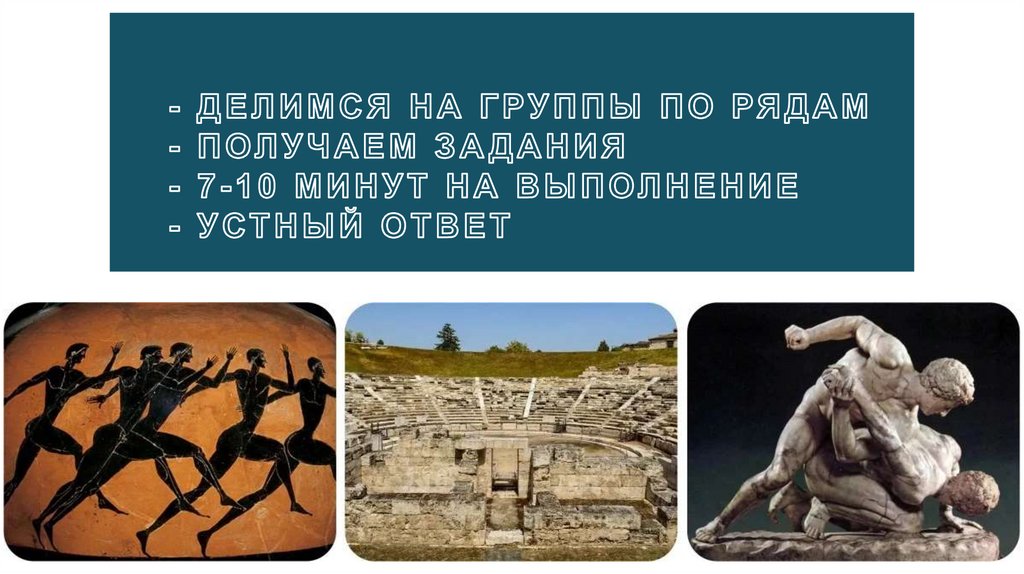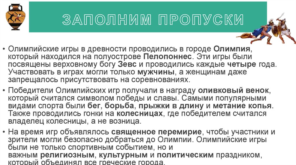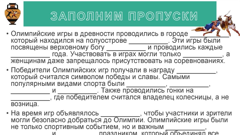 • Олимпийские игры в древности проводились в городе __________,который находился на полуострове __________. Эти игры были