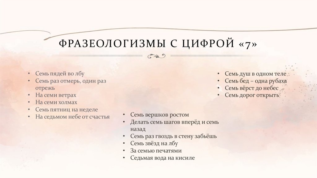 ФРАЗЕОЛОГИЗМЫ С ЦИФРОЙ « 7»• Семь пядей во лбу