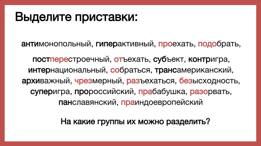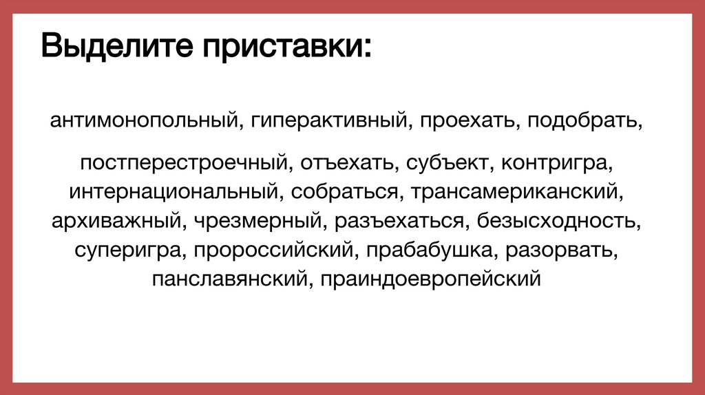 антимонопольный, гиперактивный, проехать, подобрать,постперестроечный, отъехать, субъект, контригра,