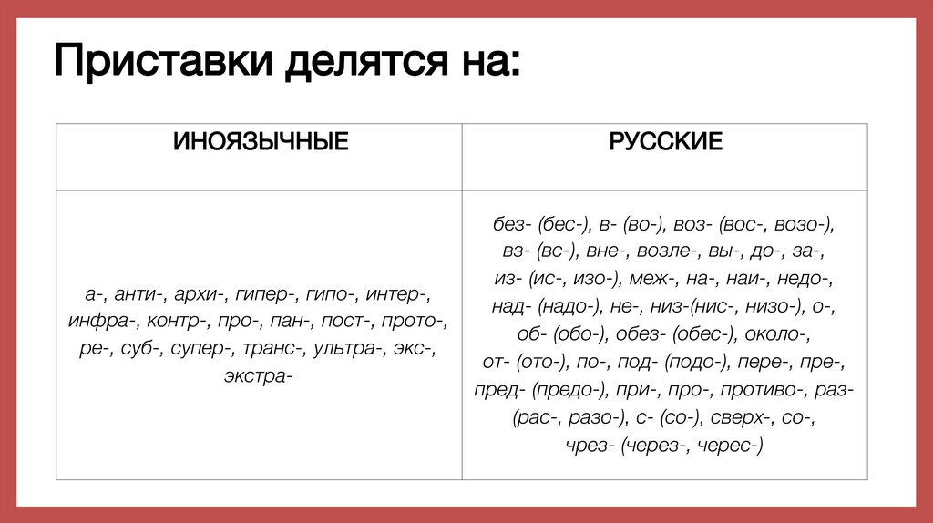 пред- (предо-), при-, про-, противо-, раз(рас-, разо-), с- (со-), сверх-, со-,