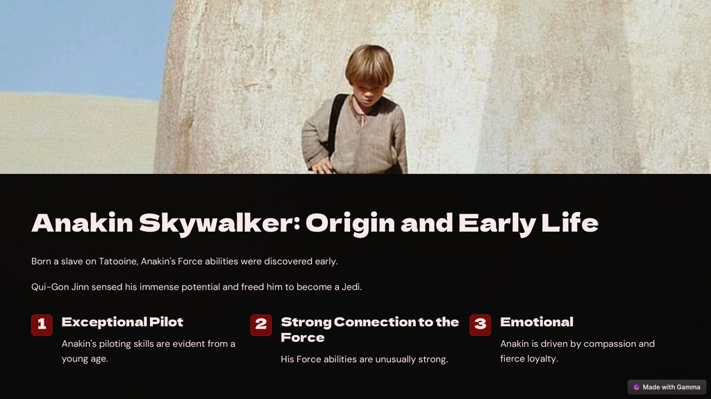 Anakin Skywalker: Origin and Early LifeBorn a slave on Tatooine, Anakin's Force abilities were discovered early.