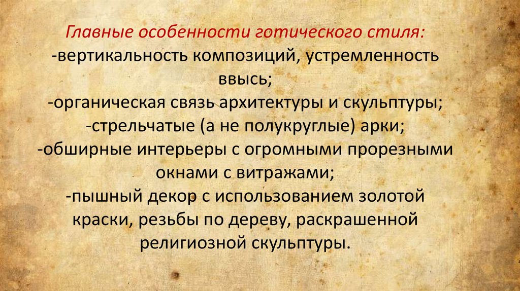 Главные особенности готического стиля:-вертикальность композиций, устремленность