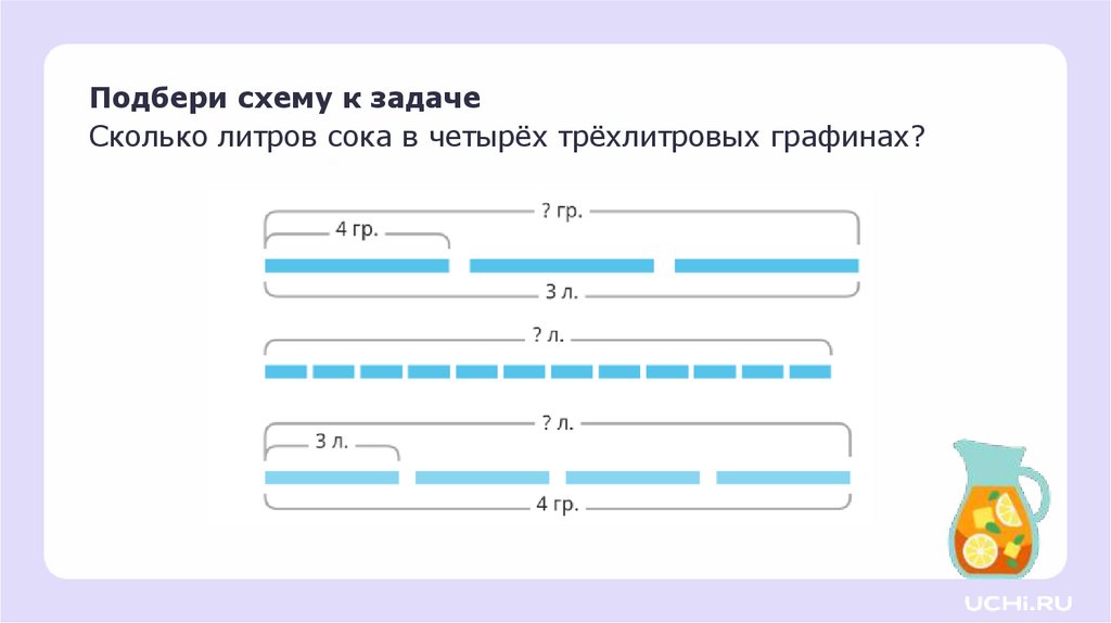 Подбери схему к задачеСколько литров сока в четырёх трёхлитровых графинах?