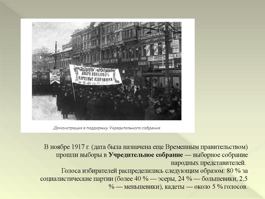 В ноябре 1917 г. (дата была назначена еще Временным правительством)прошли выборы в Учредительное собрание — выборное собрание